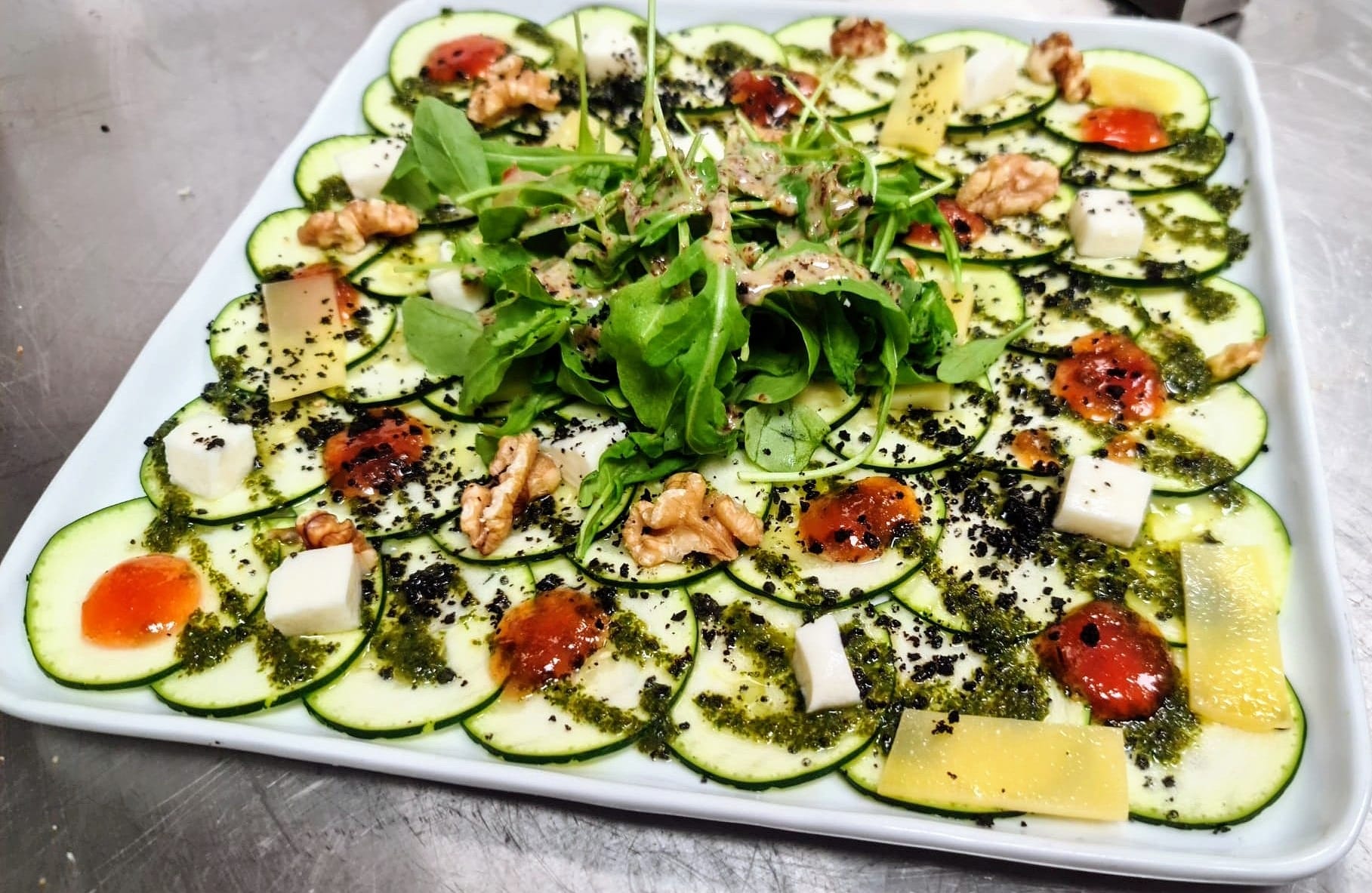 amb melmelada de tomàquet casolana, pols d’oliva negra, encenalls de formatge Comté 24 mesos, pesto d’avellanes i ruca.